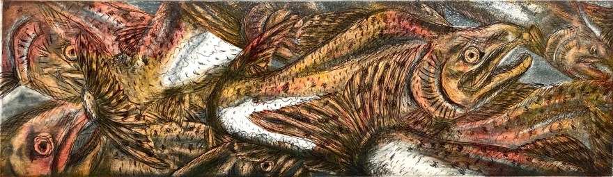 Much of my art is of the things around me. Bugs, animals, and landscapes are a few of my favourite subjects. In my prints, I attempt to bring action and tension to a still image. I primarily work with copper plate etchings, using a combination of line etch, aquatint, and mezzotint. I use multiple plates in each print, which enables me to get greater depth through colour and light.