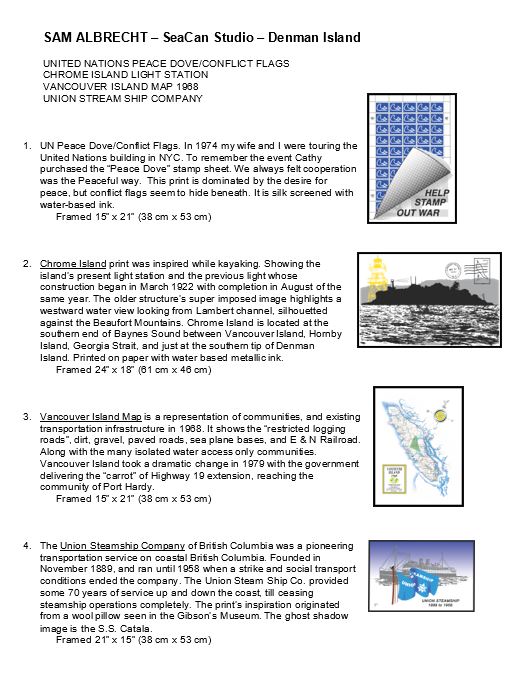 After 60 years of craftsmanship, loving the world through maps, geology, and the Art of Silk Screening, I’ve created individual prints and printed upholstered works. In my studio I’ve extended the Applied Arts into wood, and steel. You can find me in my studio on Denman Island where I have enjoyed the last 15 years.