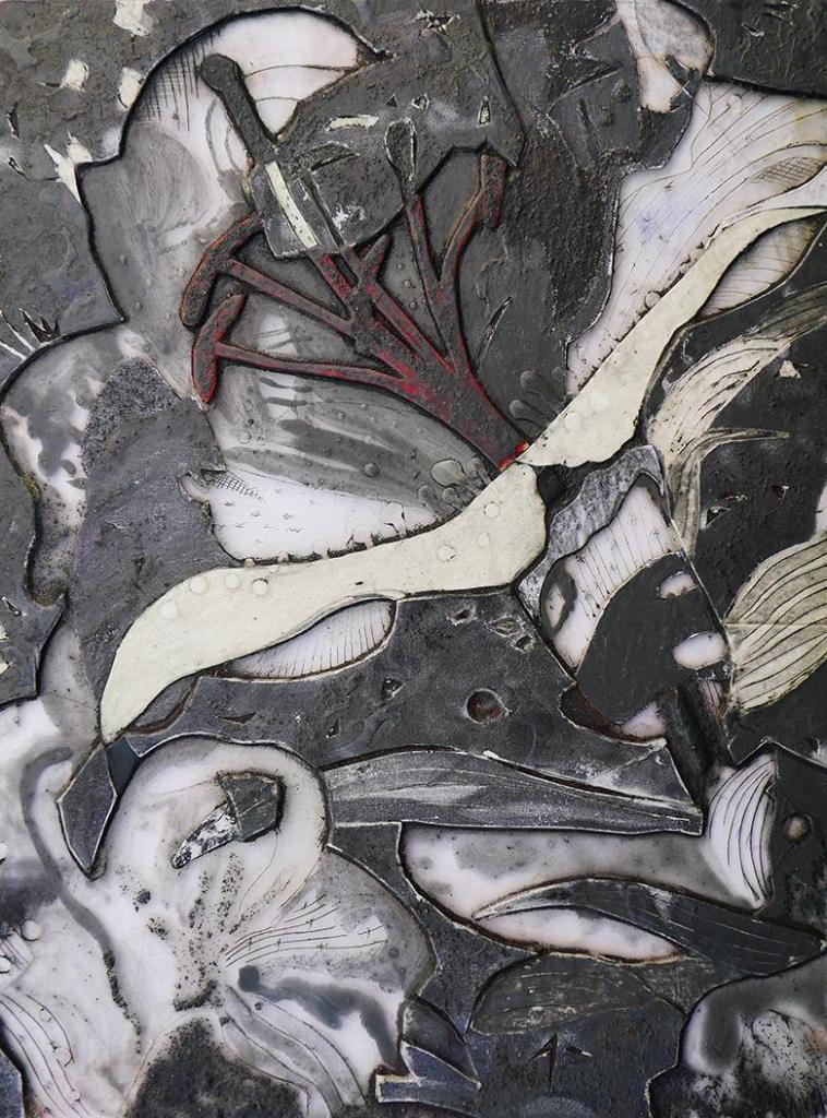 Lily Collagraph Plate, 17 x 22.7 cm, used to produce the three previous prints, materials: PCV base, mat board, carpenter glue, acrylic media, carborundum