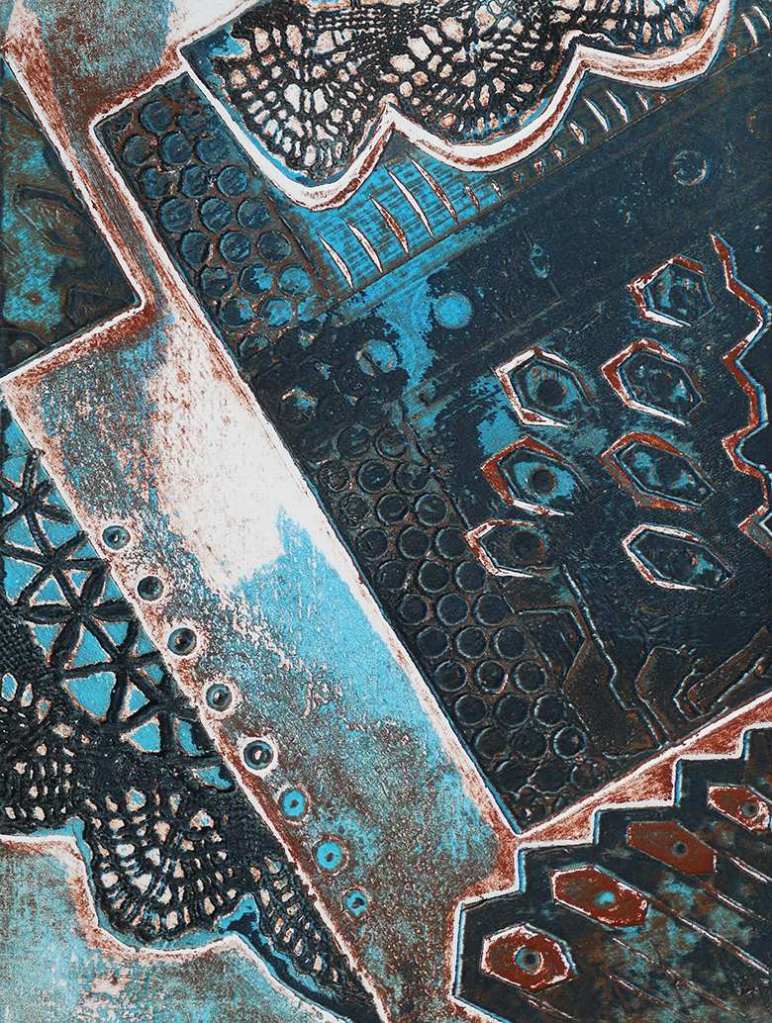 Lace, collagraph, monoprint, 13.5 x 18 cm , simultaneous colour inking