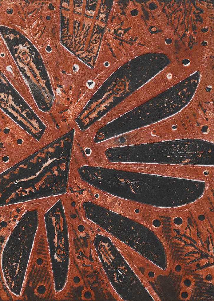 Exploding Flower, collagraph, monoprint, 13.2 x 18 cm, relief roll of sienna